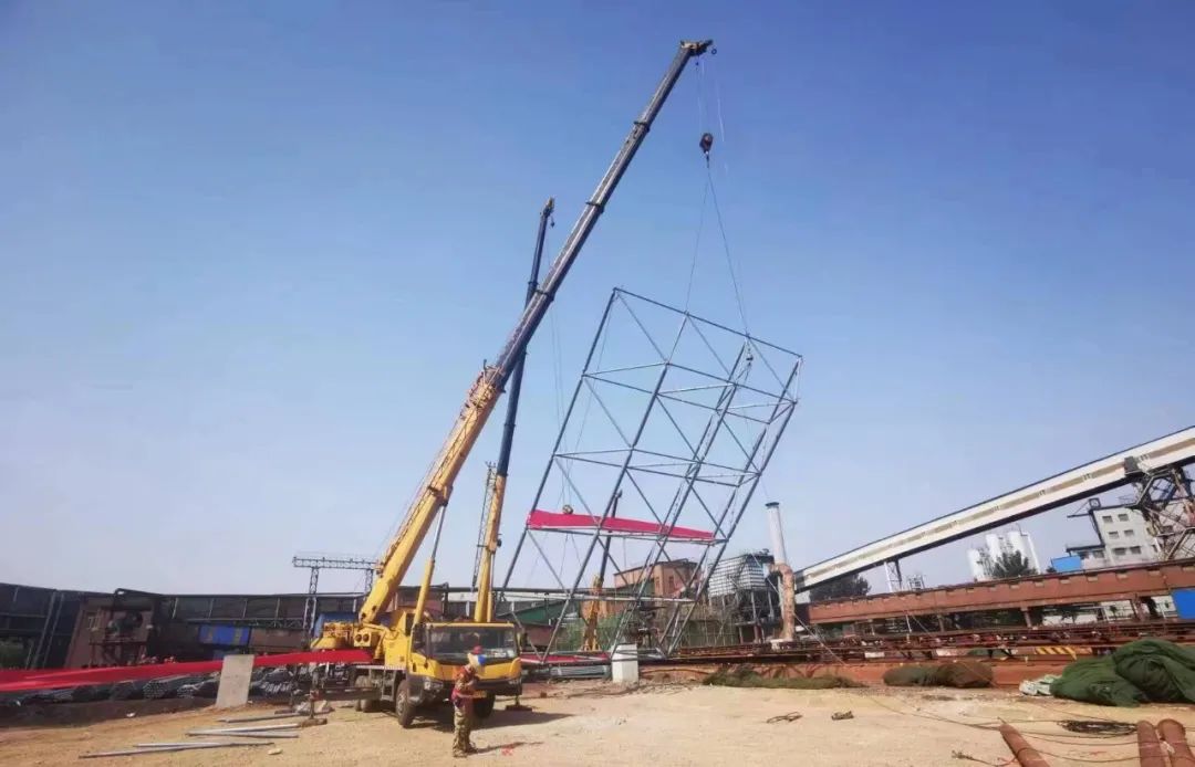 老區(qū)一次料場封閉料棚網(wǎng)架長度363米、寬度106米、高度42米,展開面積70000平方米。6月23日驕陽似火炎炎的夏日,揮汗如雨,料棚起步架順利吊裝對接完成,掀起了大干熱潮。